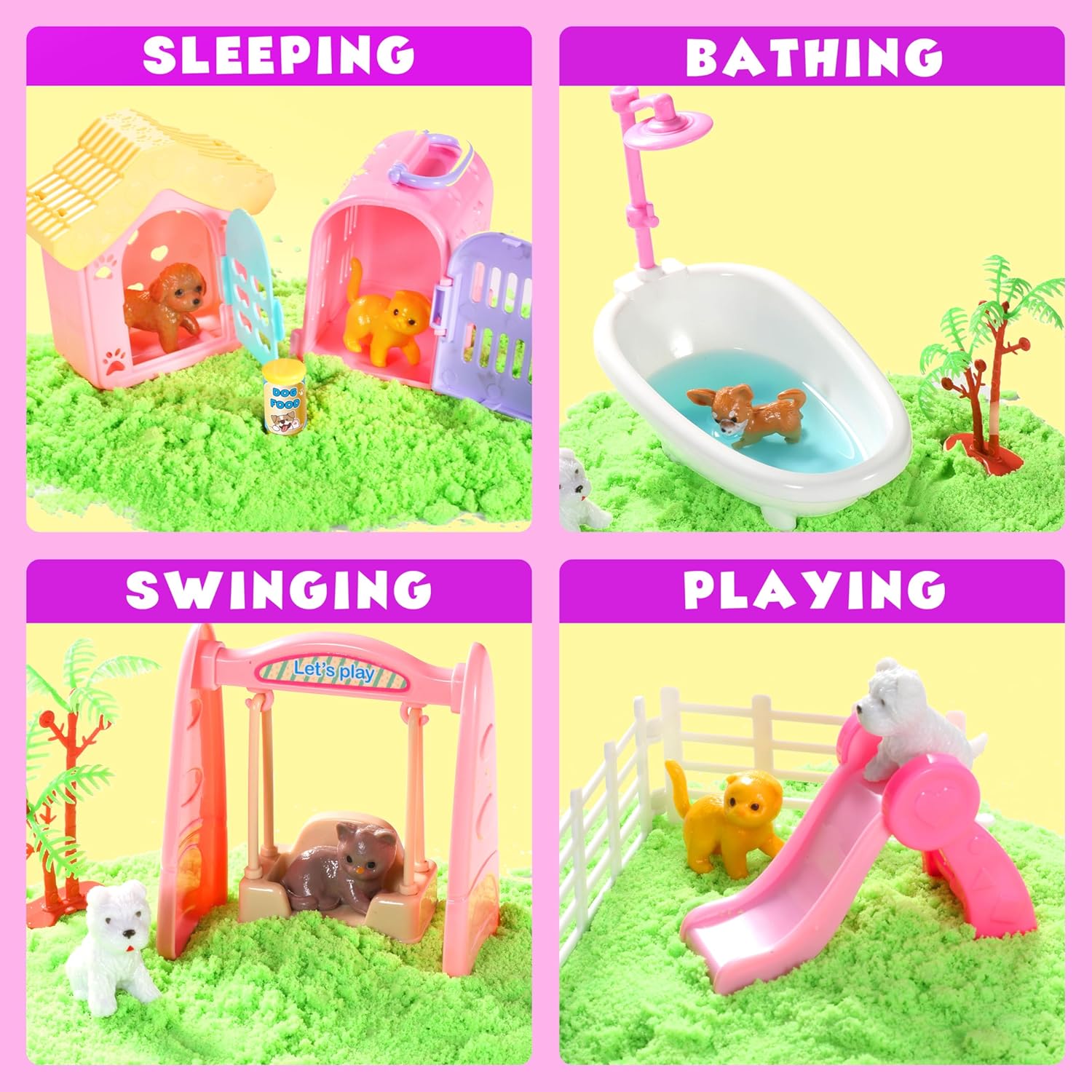 LEARN TO CARE FOR PETS:This toddler sensory playset includes green magic sand,sand box,5 dog and cat figures,dog and cat food,1 fish,1 bone,1 chicken leg,1 pet house,1 pet carrier,1 slide,1 swing,1 bathtub,1 tower,2 fences,2 pet bowls,1 scoop. Let your kids become more loving and patient by caring for pets.Bathe,feed,and play with pets,they will spend hours play with it.
