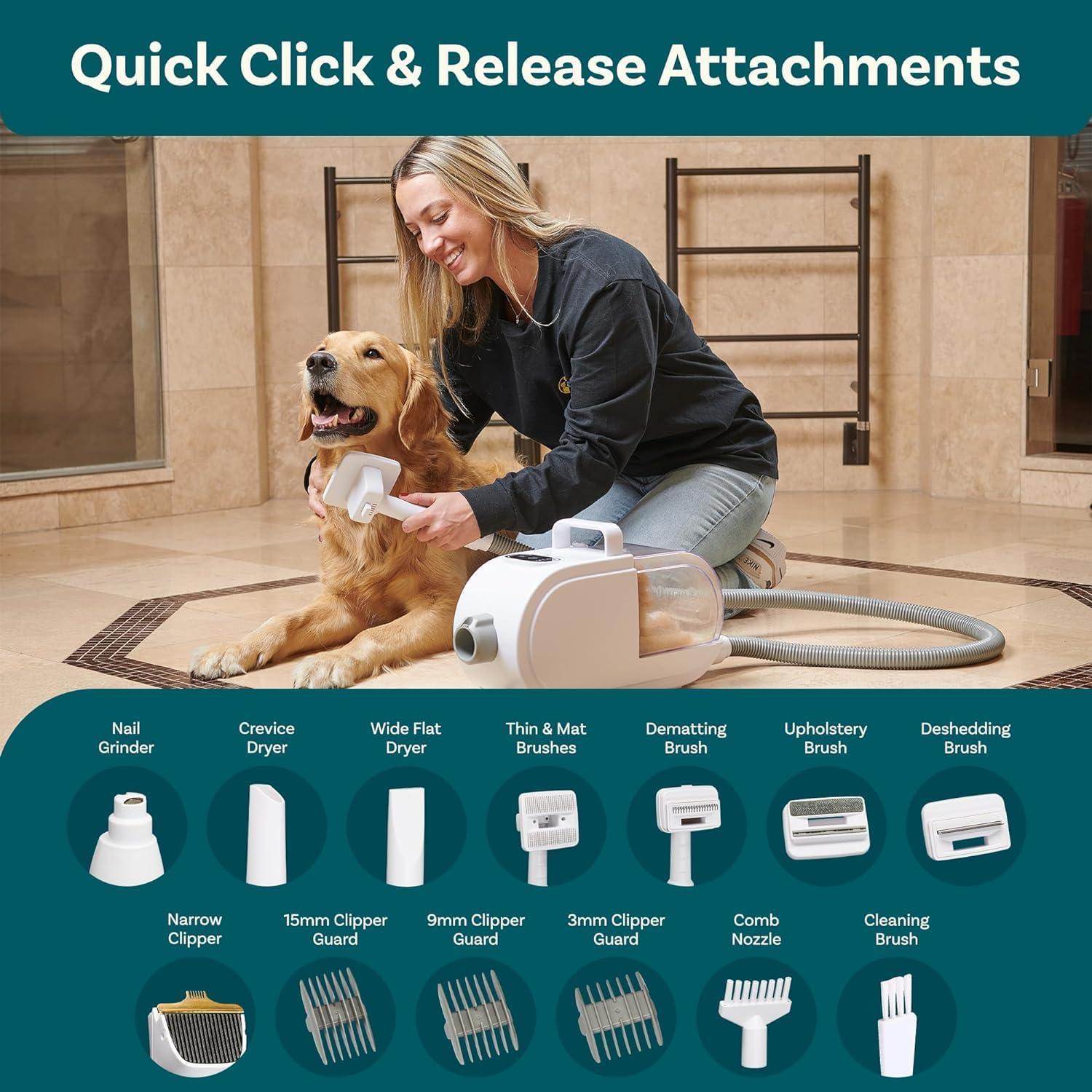 【Custom Drying & Styling】 3 blower speeds with 3 heat settings (105°F / 122°F / 140°F) let you safely and quickly dry any coat type with our dog grooming vacuum. Choose gentle airflow for sensitive pets or powerful drying after baths.
