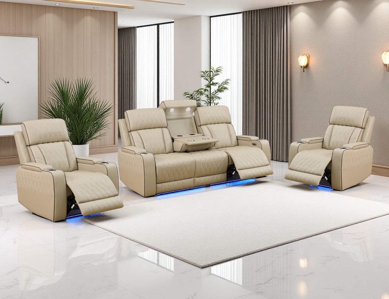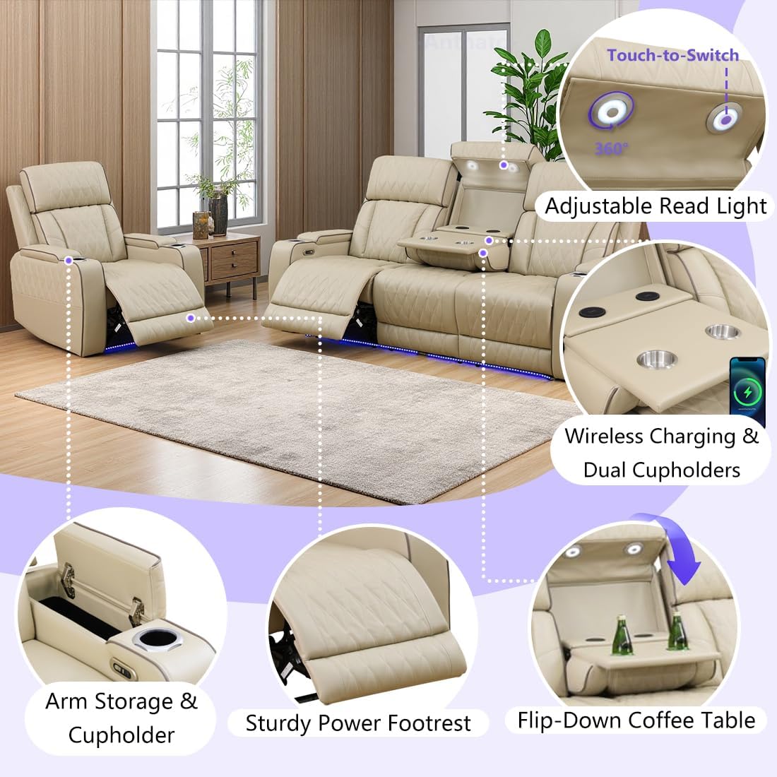 Convenient Functions: Each armrest features hidden stroage and a cupholder to store sundries and drinks. The center backrest of the 3-seater sofa can turn into a coffee table with 2 ready-to-charge zones when pulled down; the center headrest can be flipped back to a touchable and 360° adjustable read light. The center of the loveseat is a hidden storage console with 2 cup holders. These considerate designs can bring you a more convenient and comfortable life.