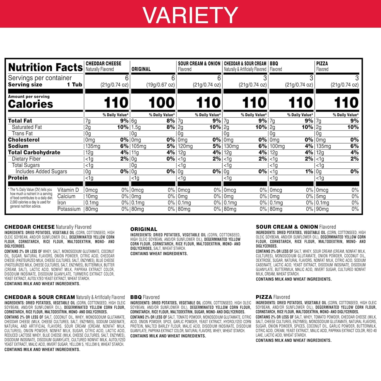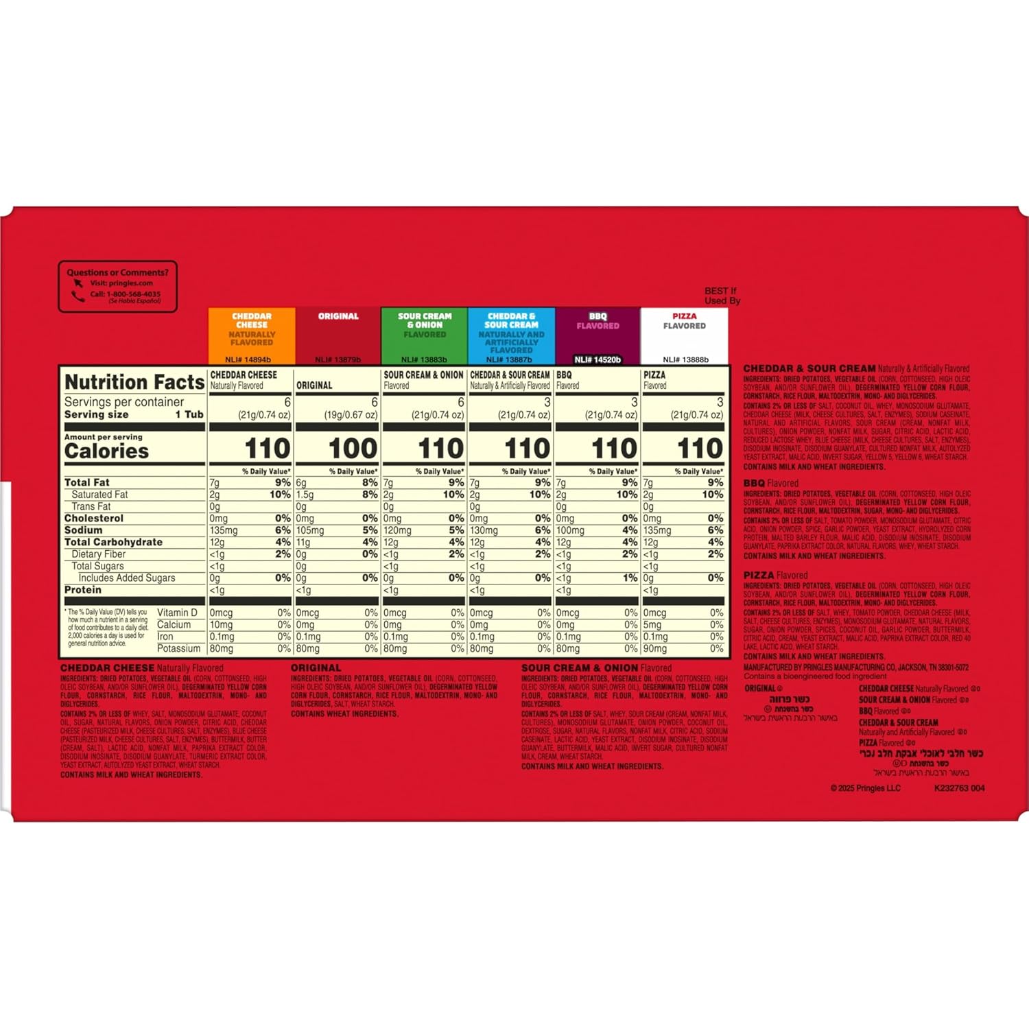 A burst of crisp, crunchy potato goodness seasoned to salty perfection. This variety pack includes six fan-favorite Pringles flavors – from classic Original to bold BBQ and savory Cheddar Cheese – so there’s something for everyone. Pringles potato crisps are ingeniously shaped, crisp and light, but never greasy. Each crisp chip delivers that signature crunch and craveable flavor in every bite. With convenient, portable snack cups, it’s easy to enjoy your favorite Pringles wherever life takes you. Grab one as a pick-me-up for after school or pack as the ultimate car snack for road trips. Bring these snacks to game time and pack a few for other Pringles fans. Stash this snack in your work desk or pantry to enjoy anytime. Share Pringles at your next cookout or BBQ to turn up the flavor and fun among family and friends. Get your hands on Pringles potato crisps chips for an irresistible taste experience that keeps you coming back, stack after stack.​