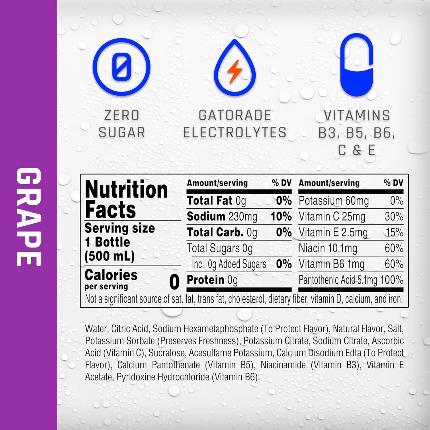 Hydrate your workout with the refreshing taste of Propel Water Grape Flavored Water with Electrolytes, Vitamins and No Sugar. A flavored water backed by the Gatorade Sports Science Institute, Propel Water has electrolytes, antioxidants and vitamins to help put back what you lose in sweat. It’s a delicious and refreshing way to hydrate your toughest workouts. Even better, Propel Water has no sugar, so you can hydrate your workout without adding back the calories you burned. This is how Gatorade does water.