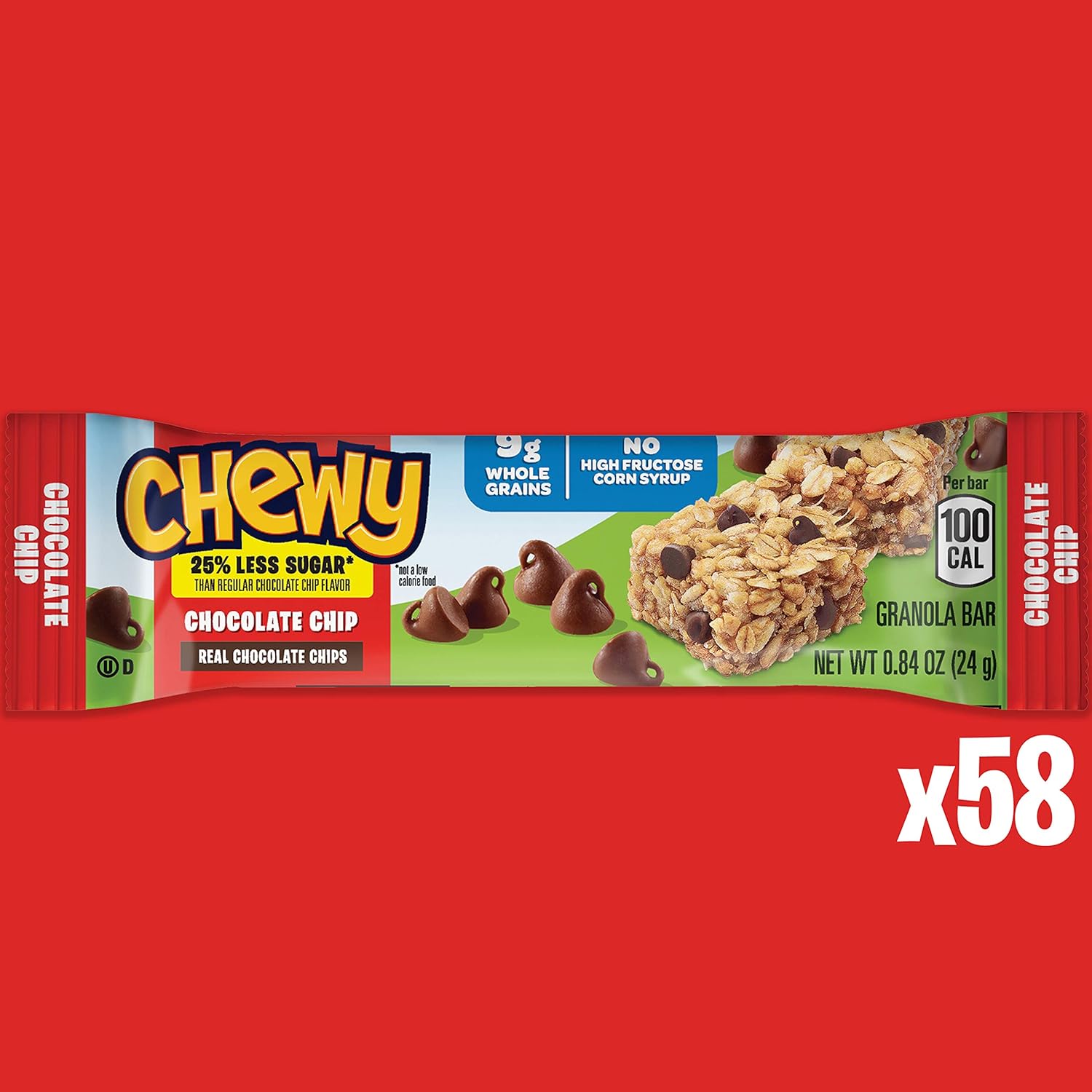 Includes 58 individually wrapped Chewy 25% Less Sugar Granola Bars, Chocolate Chip flavor