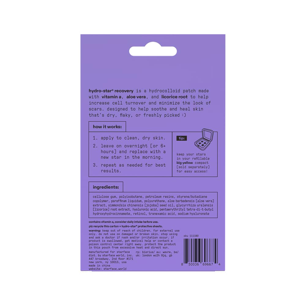 POST-PICK RECOVERY: Hydro-Star Recovery helps soothe and support skin that’s dry, flaky, or freshly picked. These hydrocolloid patches can also be used during any stage of the recovery process to help keep skin soft, soothed, and happy.