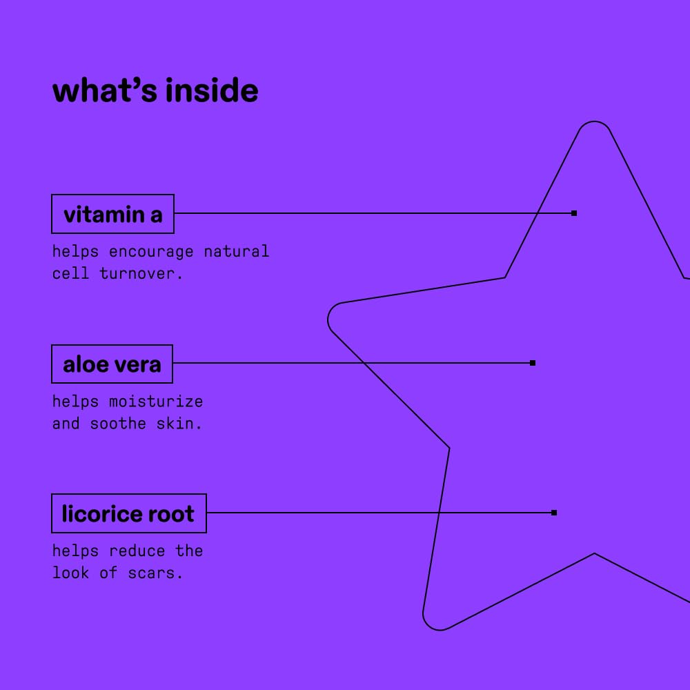 POWERFUL INGREDIENTS: Aloe vera, vitamin A, and licorice root work together to encourage cell turnover and help reduce the look of scars, all with hydrocolloid to help absorb fluid, reduce redness, and shrink spots.