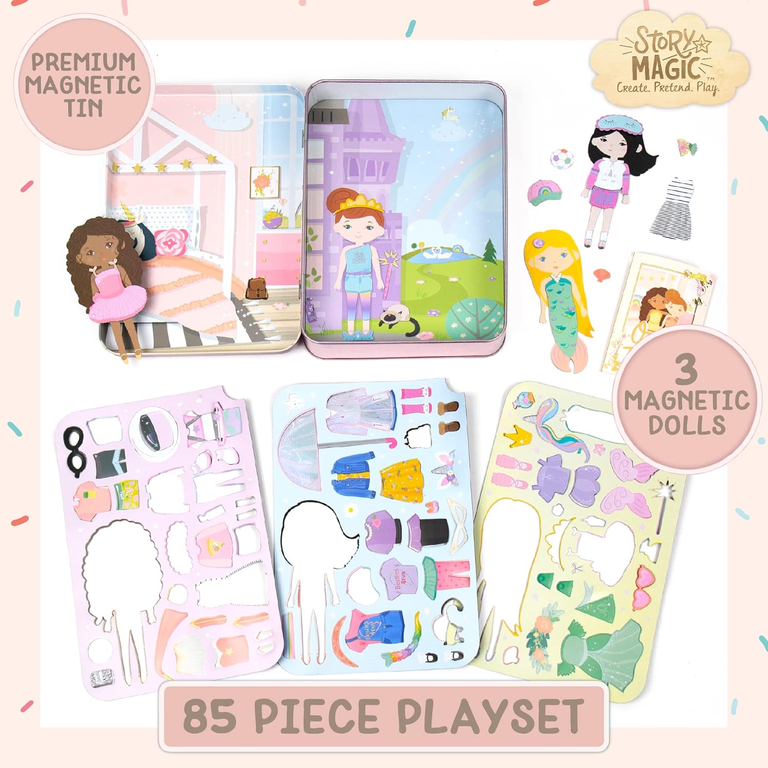 DRESS-UP 3 MAGNETIC DOLLS: Spark imagination and creative thinking with over 80 magnetic outfits and accessories to mix & match on each doll!