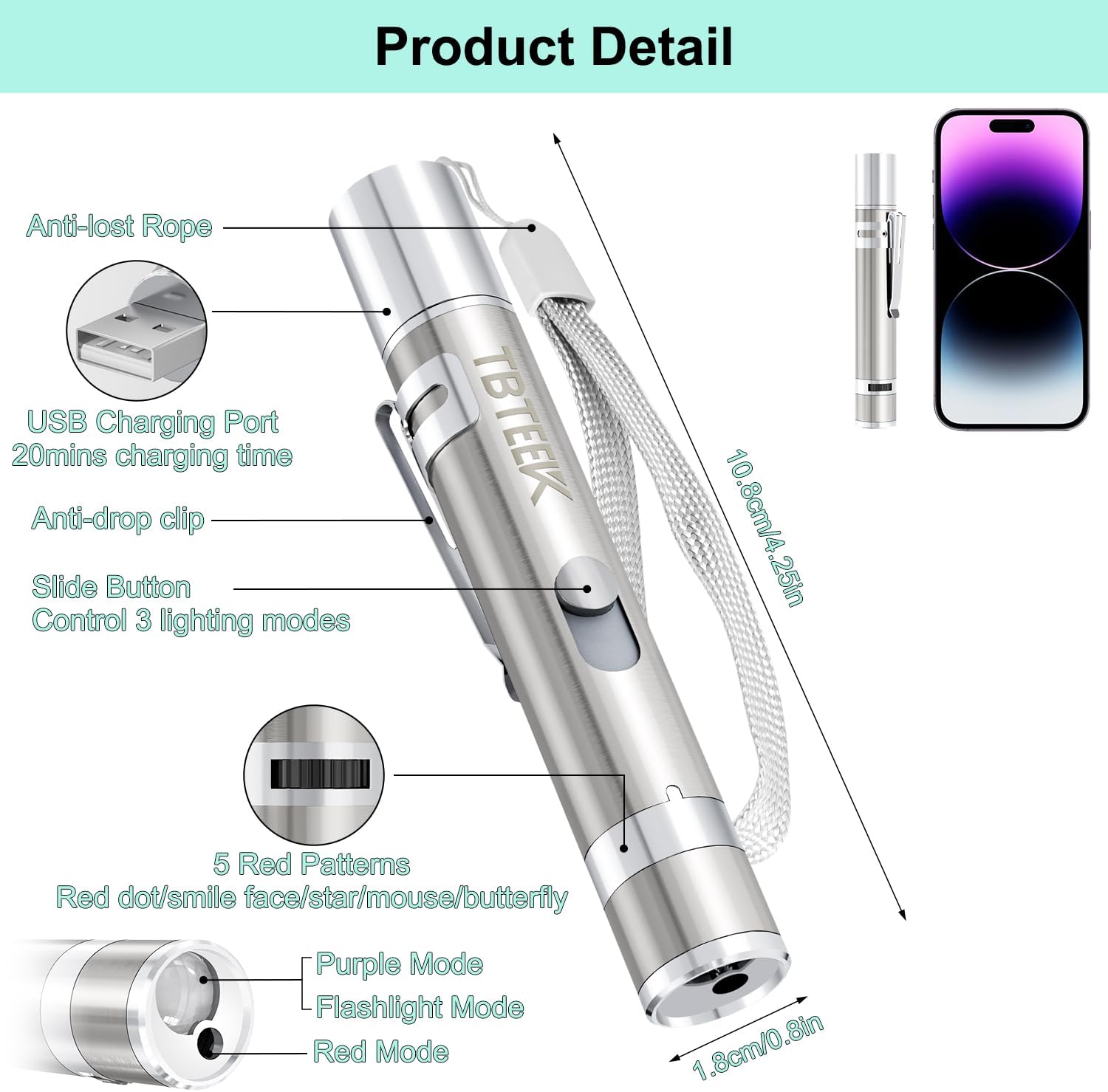 7 in 1 Modes: Scroll the gear to pick 5 red patterns(dots, smiles, mouse, stars, butterflies). The variety of patterns sparks pet’s interest, enhancing your and cats’ interaction. 3 lighting modes can be adjusted, red for cat playing, purple for checking cat skin health /money, white for mini flashlight