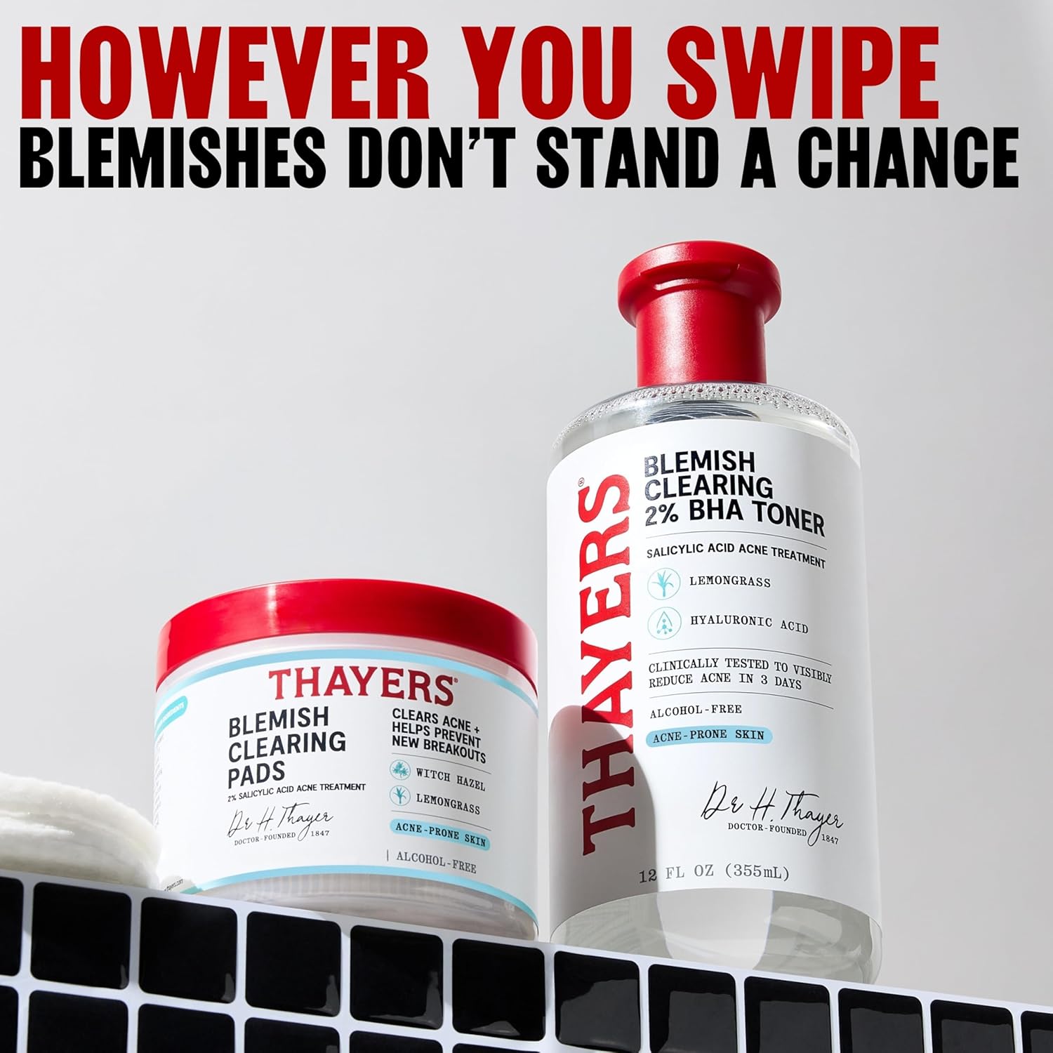 ALCOHOL-FREE BLEMISH TONER PADS FOR FACE: Thayers Alcohol-Free Blemish Toner Acne Pads clear acne blemishes, blackheads and whiteheads, while actively preventing new breakouts. Clear acne-prone skin without wrecking your skin’s moisture barrier with this women’s and men’s skin care favorite.​