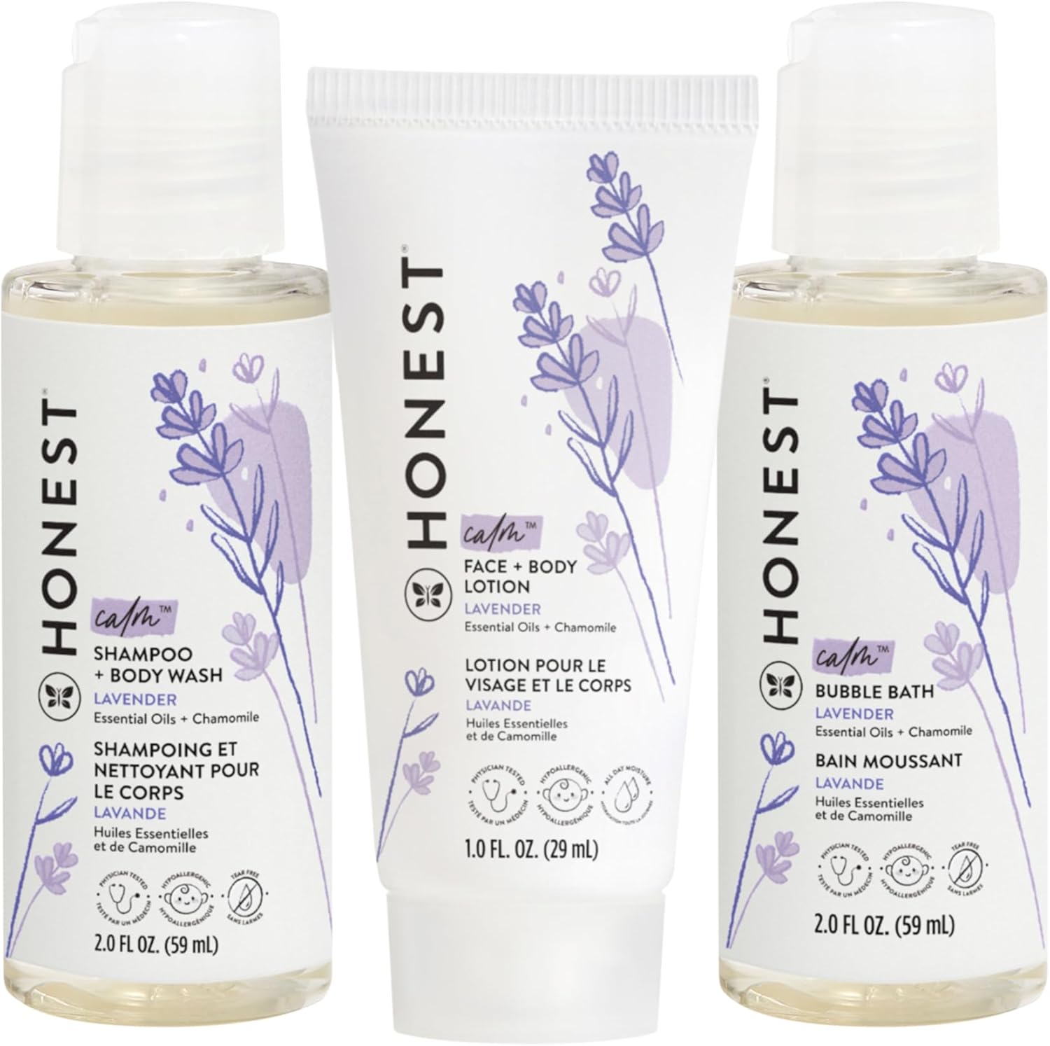 The Honest Company Babe’s Mini Must Haves Gift Set Travel Size Hypoallergenic Lavender Bathtime Essentials Shampoo Body Wash (2 fl oz) Face Lotion (1 Bubble Bath