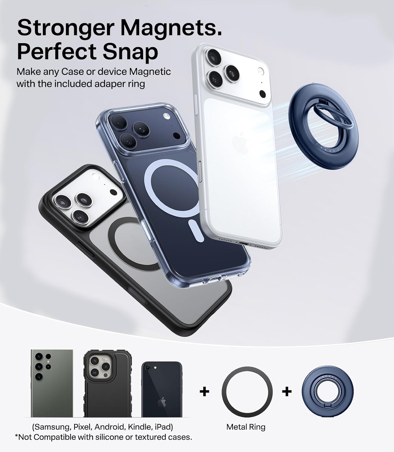 Works with All Phones: Easily attaches to magnetic cases for iPhone 11-16, Samsung Galaxy S21-S24, Google Pixel, and more. For non-magnetic cases, simply apply the included metal ring to enjoy full Magnetic grip ring holder kickstand functionality