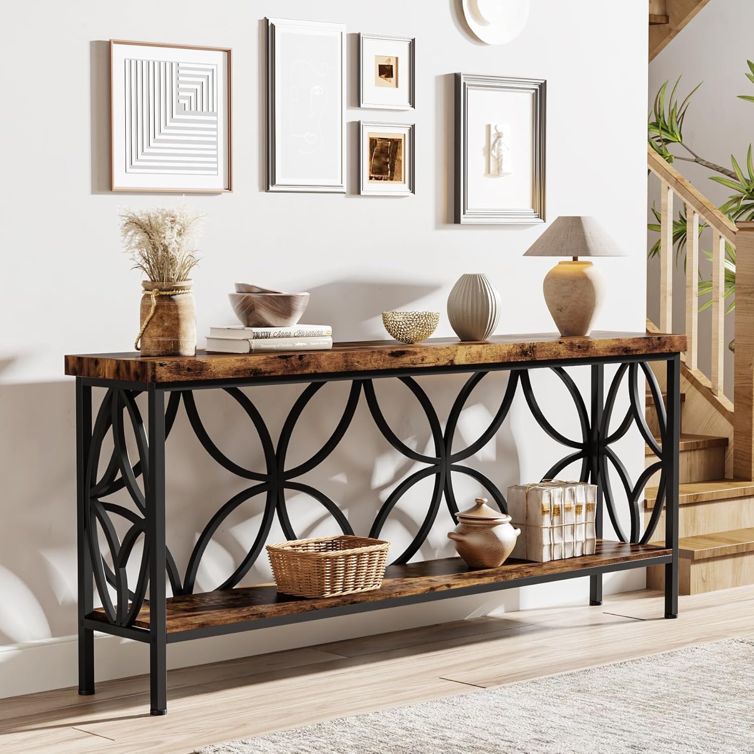 【Industrial-Style Behind Sofa Table】: Combining vintage wood grain surface with black metal accents, this long console table oozes a sense of farmhouse that has passed the baptism of time. Designed with a unique, intricately shaped metal frame on the back, this slim console table blends effortlessly contemporary style with a hint of artistic flair