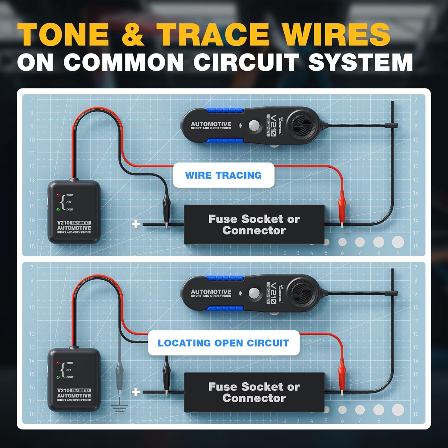 【OPEN&SHORT CIRCUIT FINDER&TRCING WIRE】VDIAGTOOL V210 automotive open & short finder circuit tester powered by 2pcs 9V batteries performs easily locating the circuit breaker point, open connections, broken wires, current leaks with tone change, even trace wire/cable without damaging the insulation. This is a convenient and efficient circuit tracer kit for DIYers, electricians, and technicians, to simply and quickly judge the continuity of the cables/wire and diagnose the breaker point. *NOTE: Designed for 6-42V DC.