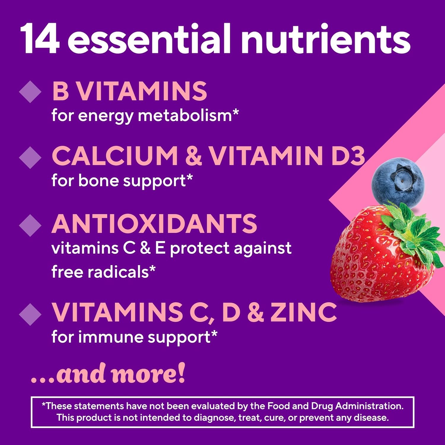 SUGAR-FREE HEALTH AND WELLNESS SUPPORT* – Each two gummy serving of these adult multivitamins for women provides essential vitamins and minerals to support energy metabolism, bone, and immune health*
