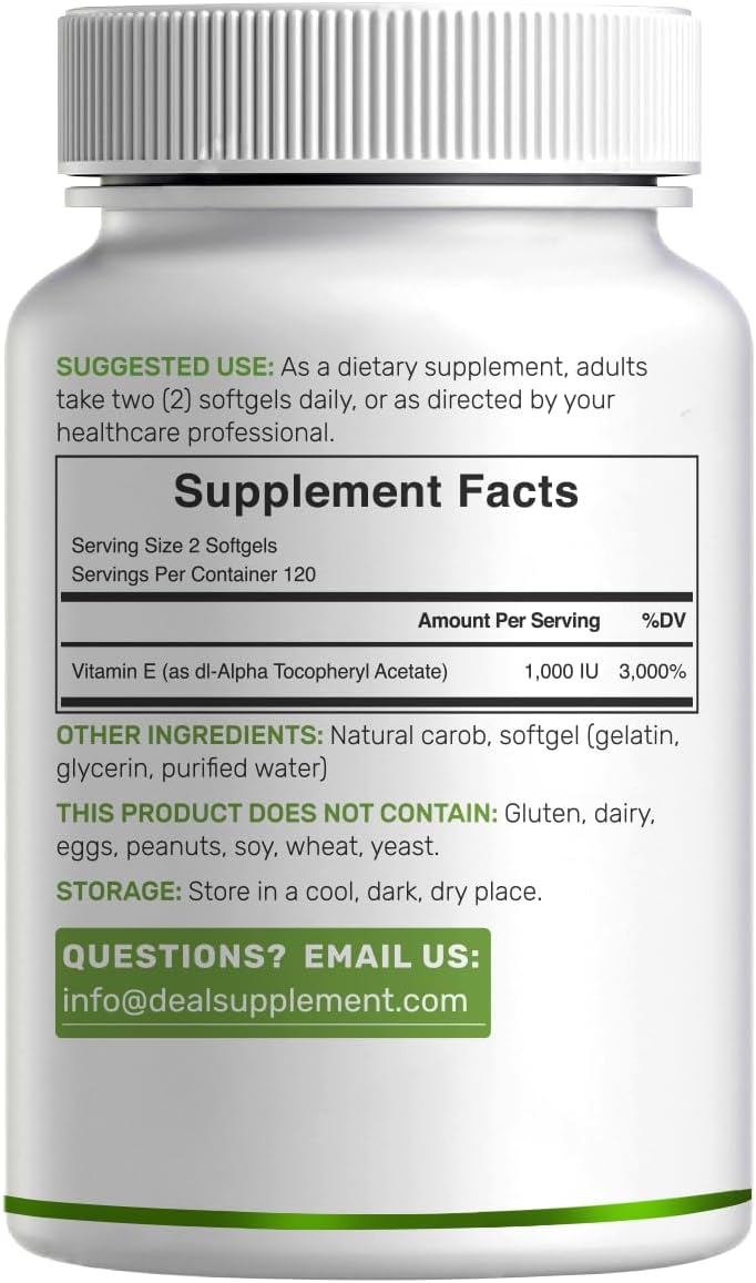 Dosage & Servings – 240 softgels per bottle with only 2 softgels per serving, supplies 1,000iu of top-grade vitamin E as dl-Alpha Tocopheryl Acetate per dose, lasts up to a 4-month supply.