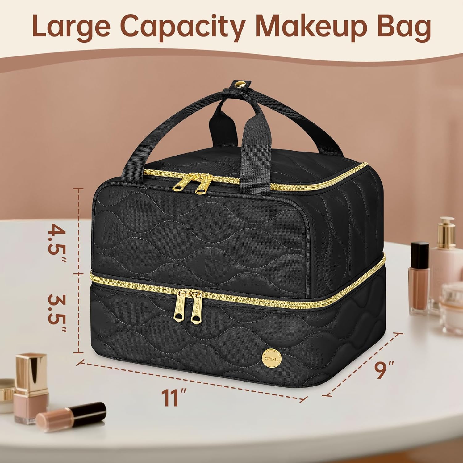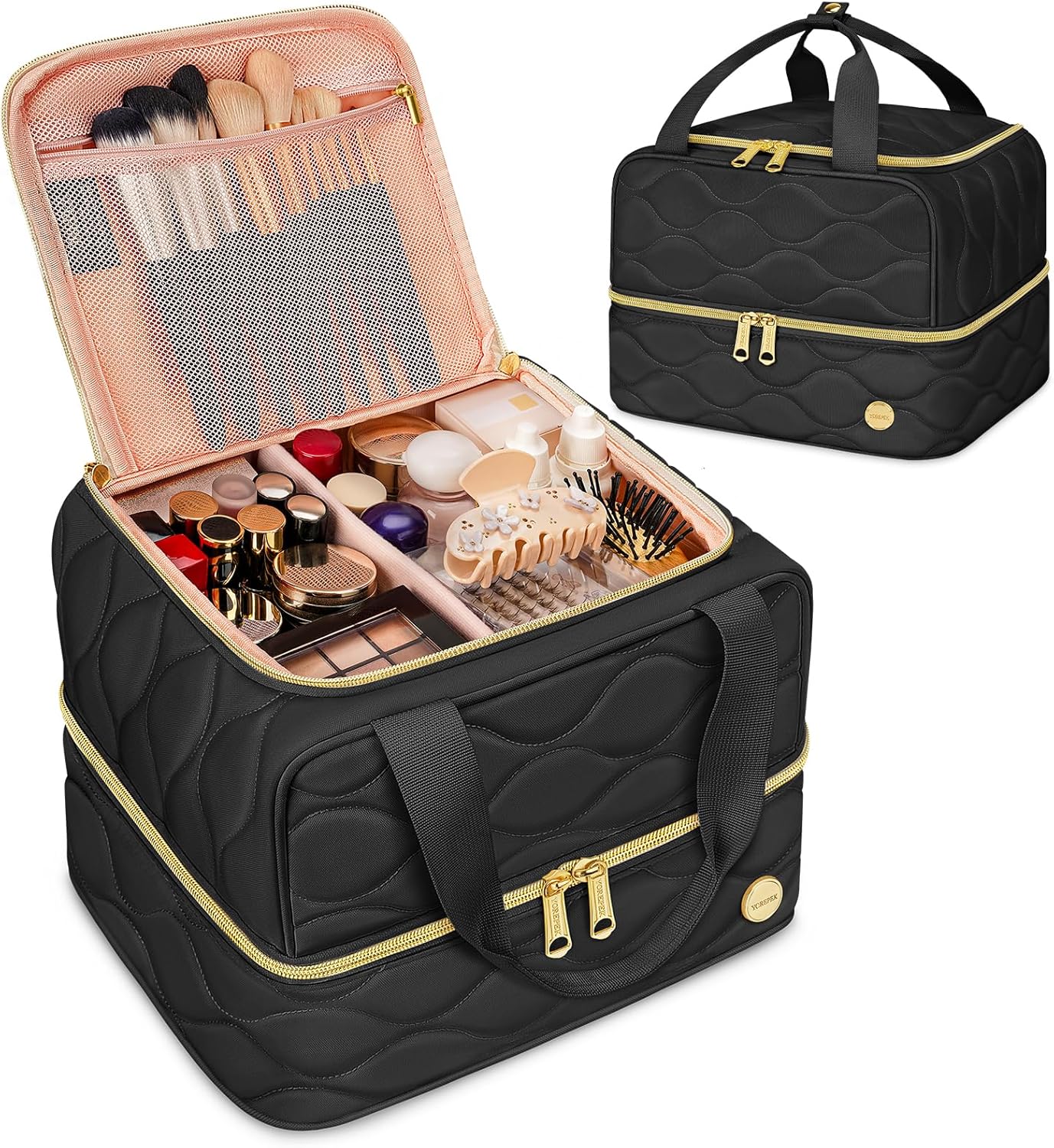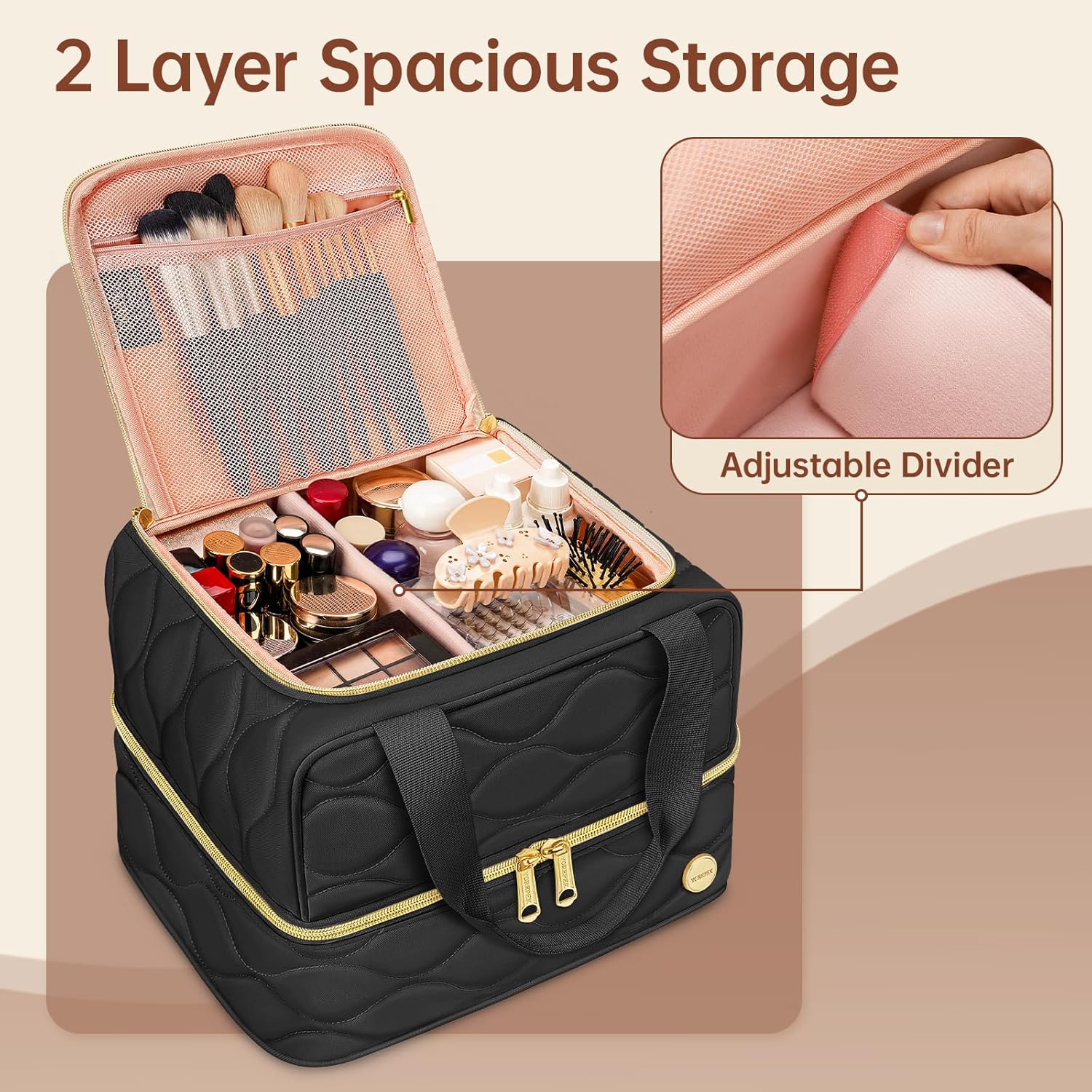 Spacious 2-Layer Design: This large makeup bag measures 11″ x 9″ x 8″, featuring a smart dual-layer layout; The upper compartment holds lipsticks, foundation, palettes, and more with a customizable divider for tailored organization; The lower compartment easily stores full-size skincare bottles, sprays, and other bulky items; Built-in 2 mesh pockets keep brushes, masks, and wipes neatly arranged