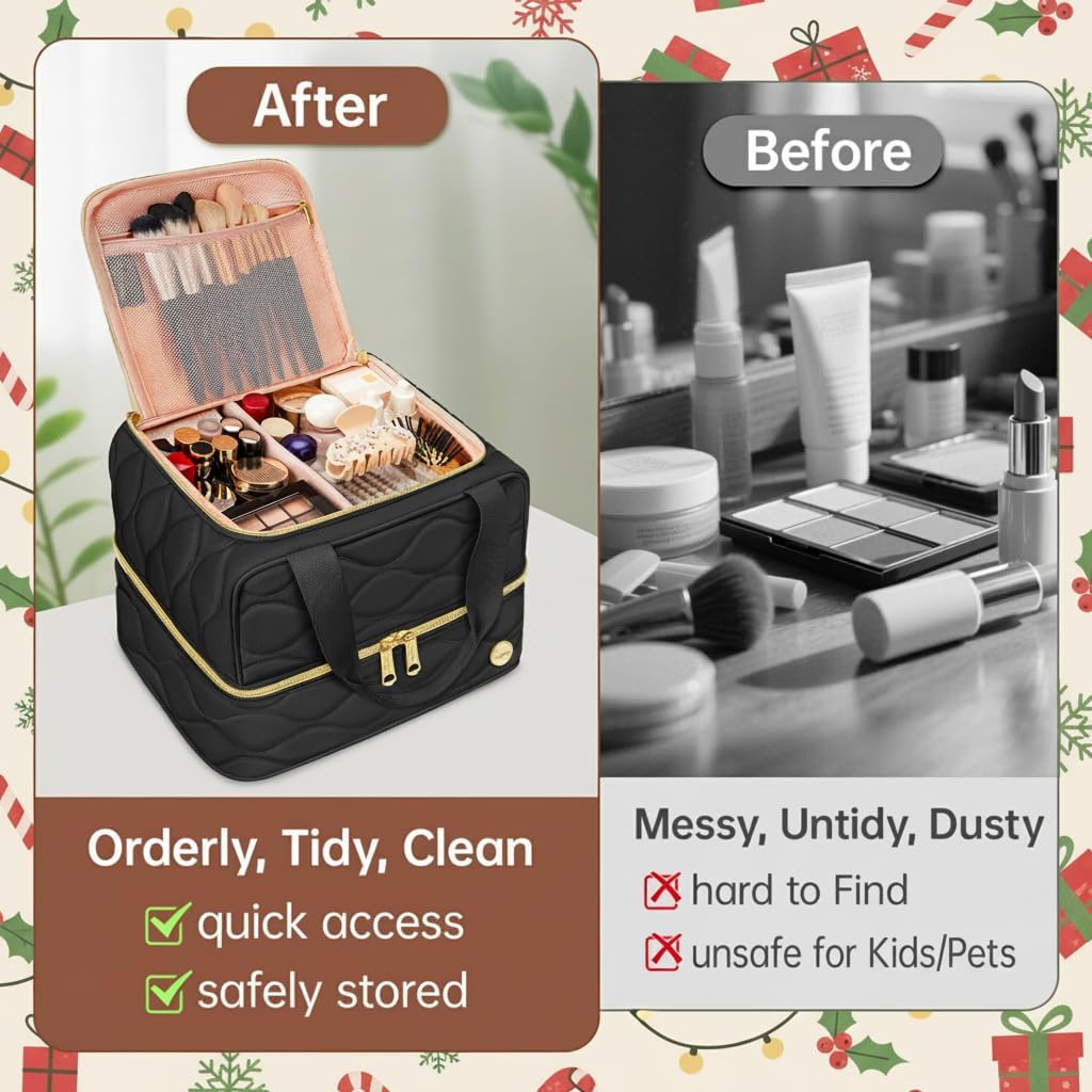 Neatly Organized, Clearly Visible With adjustable dividers and dual compartments, this large makeup organizer keeps your skincare, brushes, and cosmetics perfectly sorted—no more digging or mess.